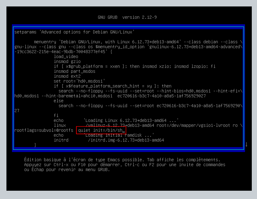 init=/bin/shaprèsquietdans la ligne Linux.