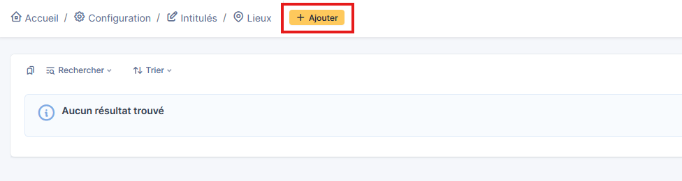 Ajout des lieux. Dans Configuration > Intitulés > Général > Lieux, créez l'arborescence géographique afin de localiser facilement les problèmes remontés. Ajoutez le "Site Baugé" et le "Site logistique Joué-Lès-Tours".
